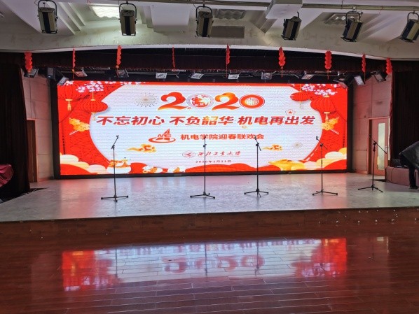 2020年1月11日下午,杏吧 在健翔楼举办了一年一度的教职工迎新春联欢会,五楼多功能大厅大型LED屏上绚丽的显示出今年联欢会的主题是“不忘初心,不负韶华,机电再出发”。