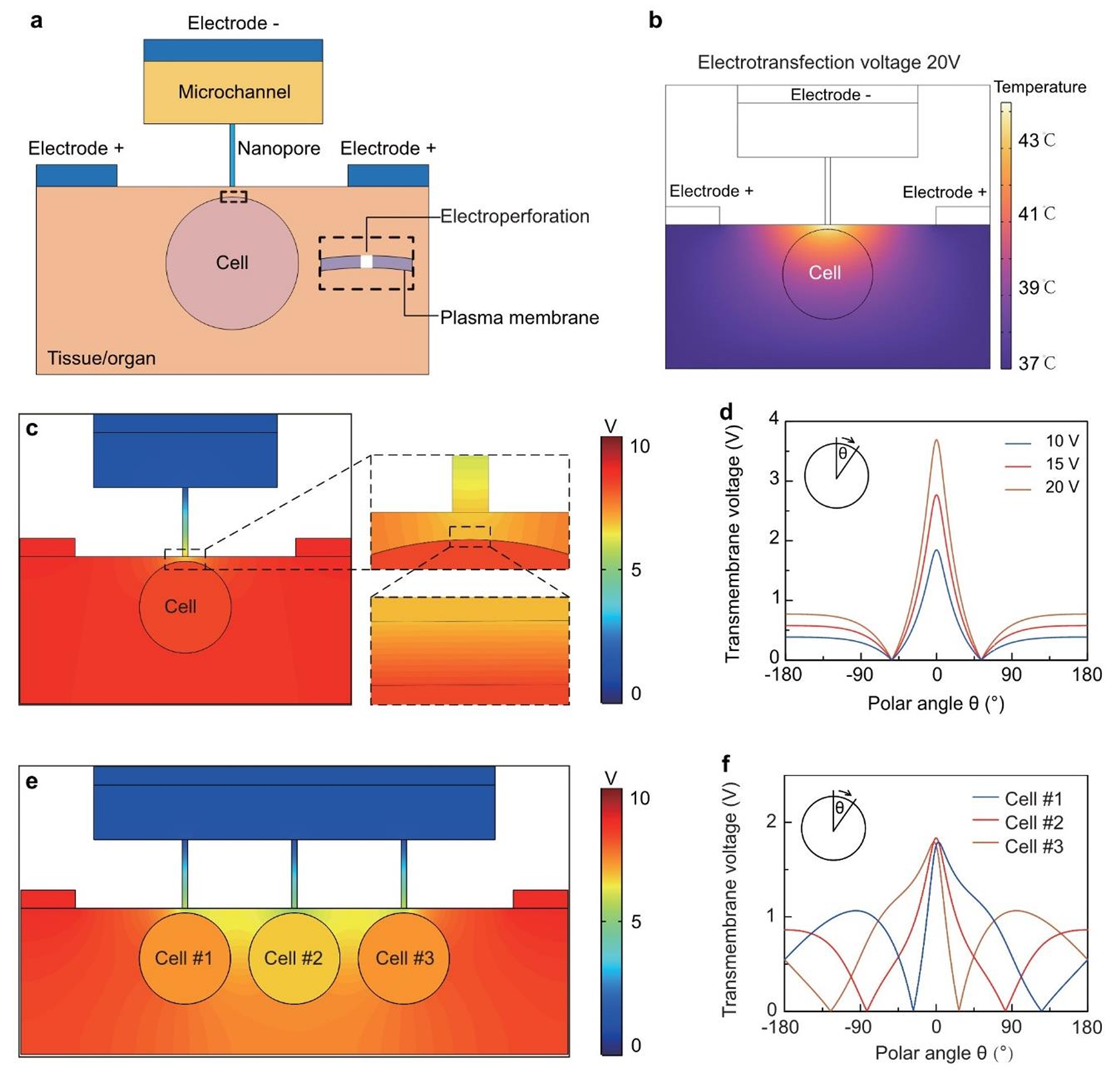 郝永存副研究员与常洪龙教授在柔性电子贴片的设计及制造方面开展深入研究,成功建立了“纳米孔-微通道-微电极”三维结构的电学、热学及力学模型(图 2),有力证明了纳米孔通道能够安全、高效且精确地在细胞膜上穿孔;攻克了聚合物-金属多层微纳结构制造技术难关,并依托杏吧