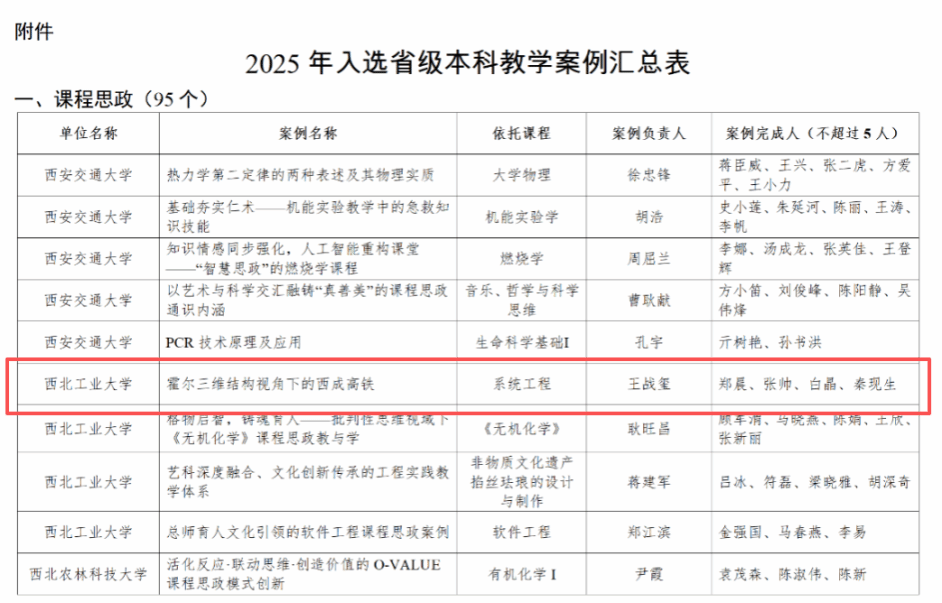 王战玺教授团队依托《系统工程》课程的教学案例-《霍尔三维结构视角下的西成高铁》、王文东教授团队的教学案例-《基于电工学课程的“六位一体”课赛融合教学新模式探索与实践》成功入选省级本科教学案例。
