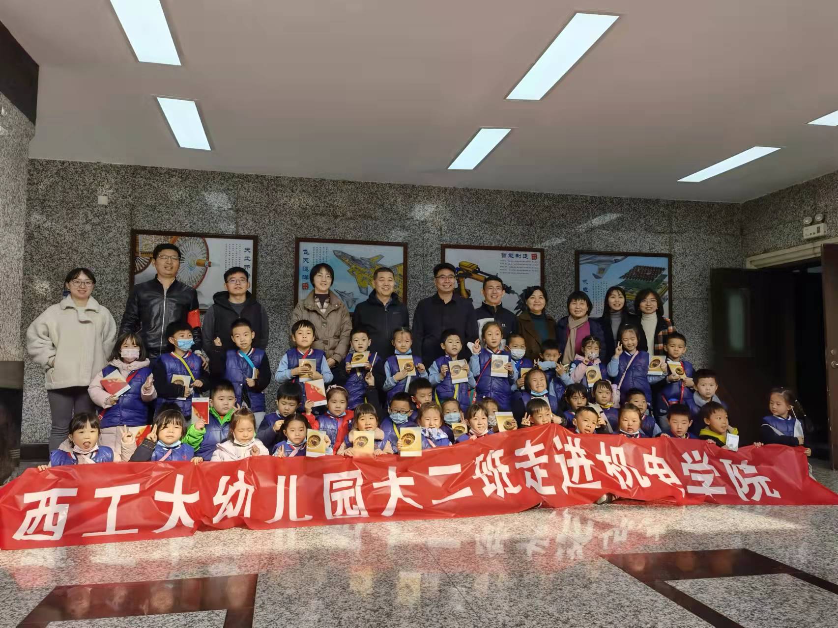 老师的带领下,小朋友们分别在室外和室内多个展区进行了参观学习。在天工机械广场,孟亮老师为小朋友幽默风趣的介绍了展陈的系列机械雕塑和文物,回顾了老一辈西工大人报效国家、发展先进航空制造技术的情怀;在学研一体化实验教学中心,小朋友们目不暇接地打探着各种各样先进的数字化、智能化制造装备,骆彬、石磊老师的讲解让他们收获满满,同时还收获了棉花糖等礼物;在空天结构技术重点实验室及太空原位制造月球基地,朱继宏和张亚辉老师浅显易懂的语言,为小朋友们描摹了未来航空航天科技和太空探索开发的发展蓝图,并请小朋友们亲手触摸太空增材制造样品;最后,陈登凯和卢凌舍老师带领大家参观工业设计文化走廊,让小朋友们认识了国家重大工程及日常生活中的工业设计应用。