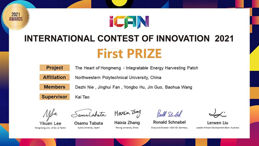 本科生团队作品“鸿蒙之心——可集成式自然能量采集贴”(The Heart of Hongmeng - Integratable Energy Harvesting Patch)荣获国际总决赛第一名,这是本届比赛中国代表队唯一获得一等奖的作品,也是西工大参加该比赛十几年以来取得的最好成绩之一。