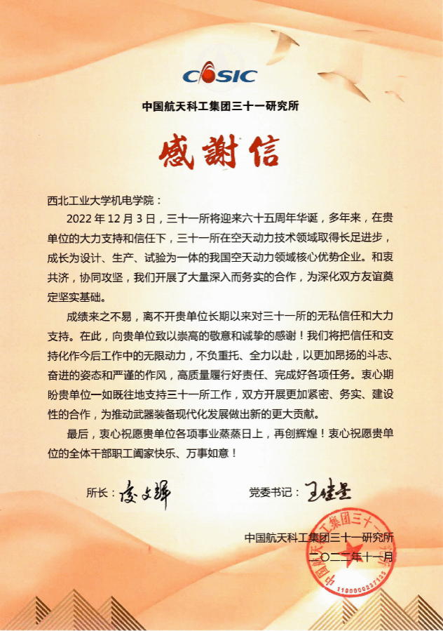 张卫红院士研究团队收到了来自中国航天科工集团三十一所,署有凌文辉所长和王继星书记亲笔签名的感谢信。这不仅是对杏吧