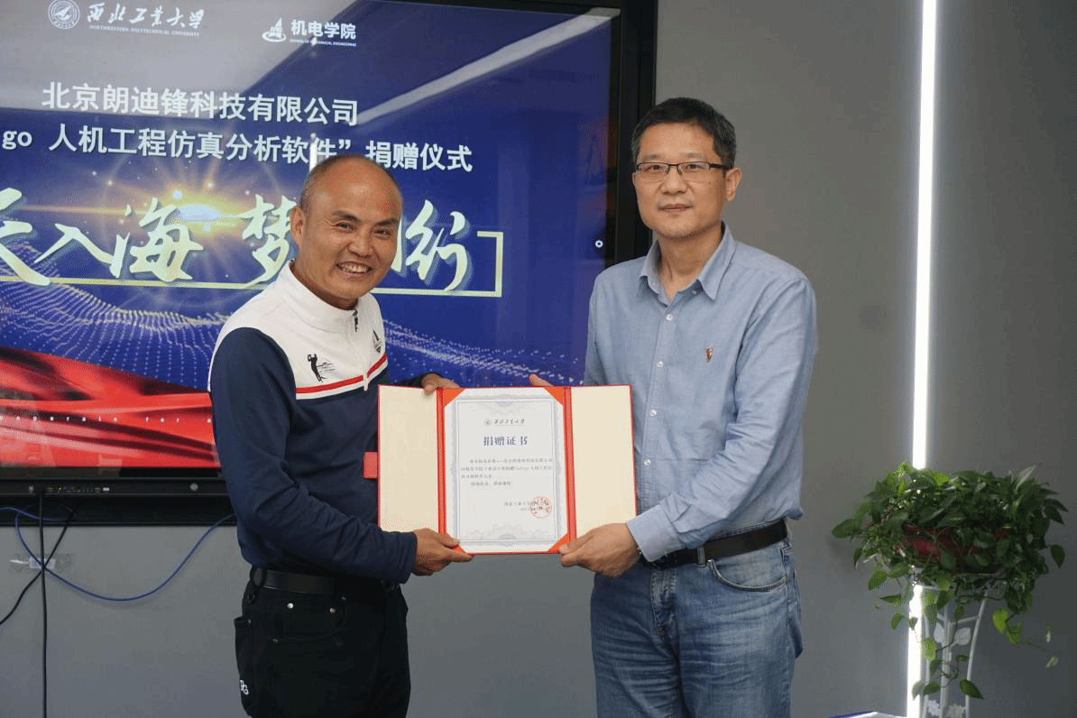 向北京朗迪锋科技有限公司姜明星颁发捐赠荣誉证书。常院长表示,朗迪锋的慷慨捐赠代表着双方合作的起点,SoErgo软件作为全国产化人机工程仿真分析工业软件,满足国防科研中全流程保密需求,对保障国家科技安全具有重要意义。
