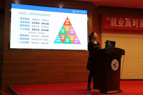 李慧老师从专业的角度对求职过程中的简历制作和面试展示等进行了讲解,将简历和面试的目的概括为说明经历、展示能力、证明岗位胜任力三大部分,同时对求职简历的逻辑架构、招聘简章的解读、面试问题的回答等一一进行了解答。