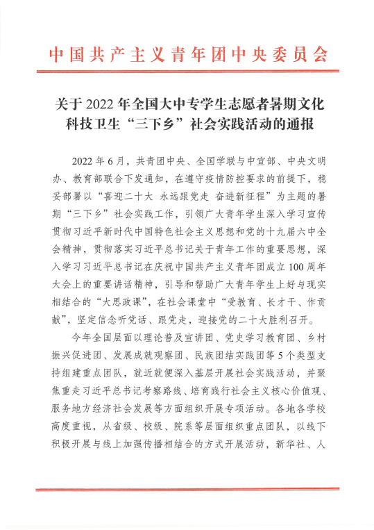 为深入总结交流经验选树典型宣传推动引领示范激励广泛参与发挥育人实效 20221012,中国共产主义青年团中央委员会发文,通报表彰2022年全国大中专学生志愿者暑期文化科技卫生“三下乡”社会实践活动表彰结果。杏吧 团委获评2022年“三下乡”社会实践优秀单位,杏吧 “追火箭的年轻人”实践队获评2022年“三下乡”社会实践优秀团队。