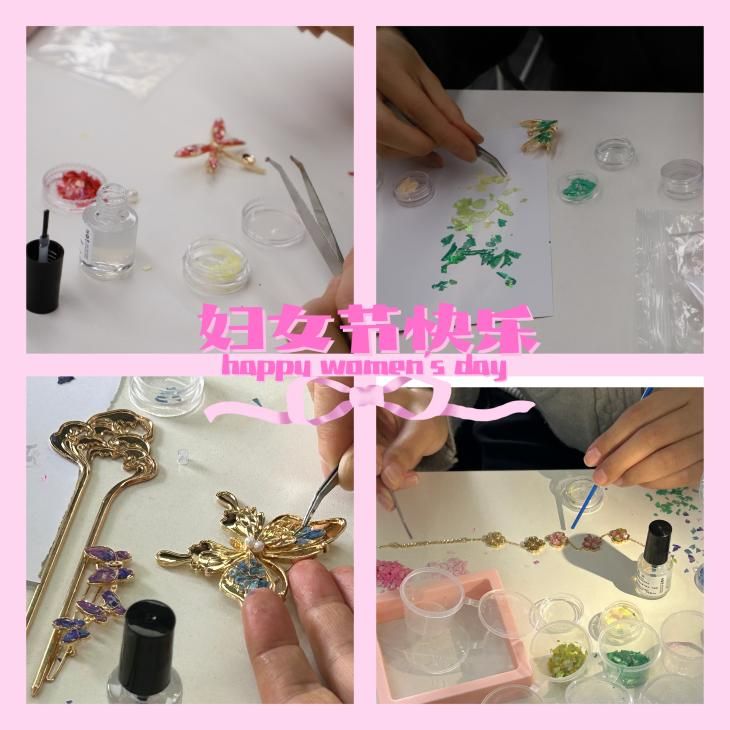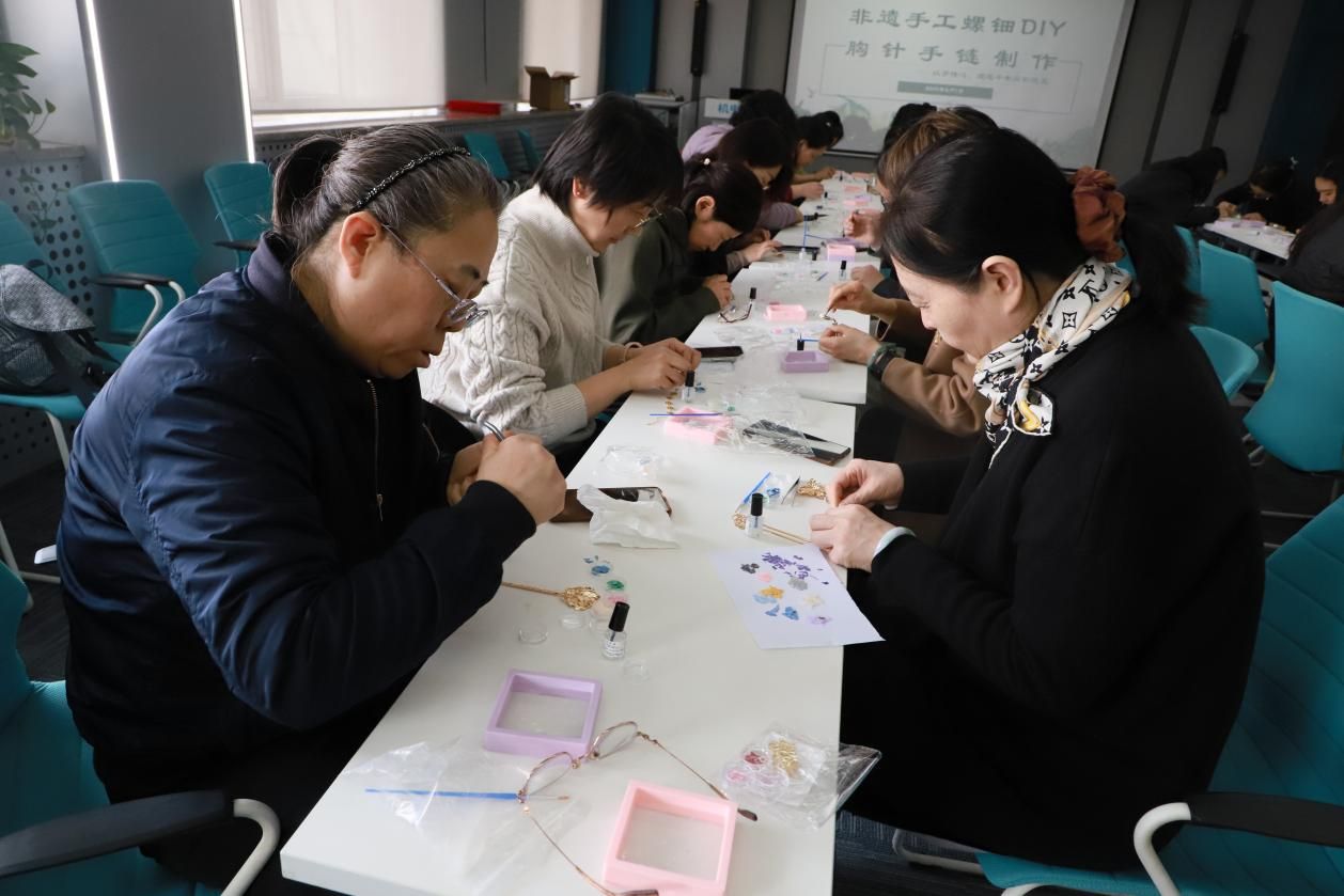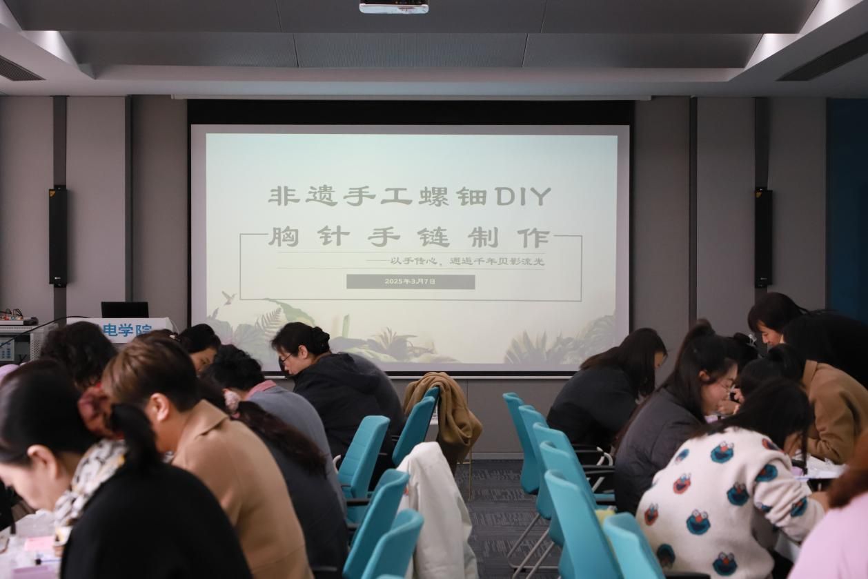 工会精心策划"以手传心,邂逅千年贝影流光"主题庆祝活动,为女教职工送上别样节日祝福。在B410教室内,30余名女教师化身"非遗传承人",认真制作螺钿胸针手链。