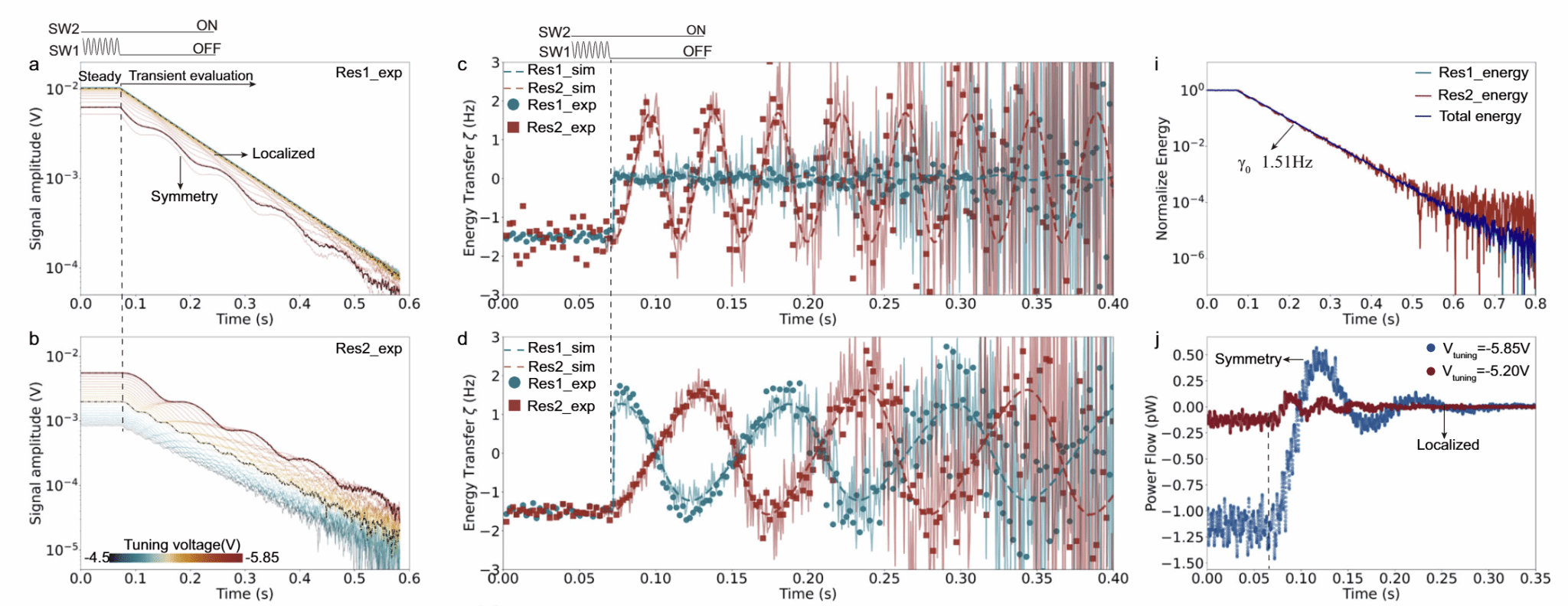 微机械耦合谐振器为研究安德森局部化、宇称不守恒等诸多经典和量子物理现象提供了理想模型,理解耦合谐振器间的能量传递机制对于声子相干操控具有重要意义。该工作设计了一种频差为9.6 Hz的超低耦合率微机械耦合谐振器系统,在振铃(Ringdown)响应中首次直接观察到显著的周期性拍频现象,为耦合谐振器能量相干传递研究提供了清晰的实验证据。该团队通过对系统瞬态能量平衡的深入分析,揭示了由Duffing非线性和模态局部化共同作用产生的混合能量操控机制;非线性能够显著放大能量转移率,并且在特定条件下谐振器间交换的能量远超其向环境耗散的能量;而幅值比时域响应则可以用于表征非线性状态下的能量传输和局部集中行为。