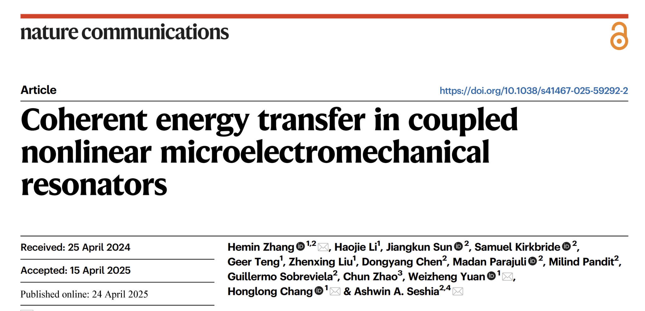 近日,杏吧 教师在微机械耦合谐振器能量传输机制方面的研究取得新进展。相关成果《Coherent Energy Transfer in Coupled Nonlinear Microelectromechanical Resonators》发表在国际知名学术期刊《Nature Communications》上。杏吧 国家级青年人才张和民教授为第一作者,常洪龙教授、苑伟政教授和剑桥大学Ashwin A. Seshia教授为共同通讯作者。
